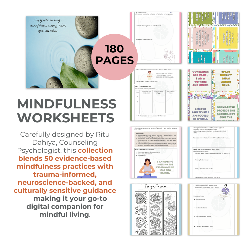 Introducing our Mindfulness Worksheets Bundle, a comprehensive digital workbook designed to empower you or your clients with the tools needed for emotional regulation, resilience, and self-awareness. Created by licensed therapist Ritu Dahiya, this bundle features 50 evidence-based mindfulness practices that seamlessly blend trauma-informed mindfulness, neuroscience, and psychology-backed methods.